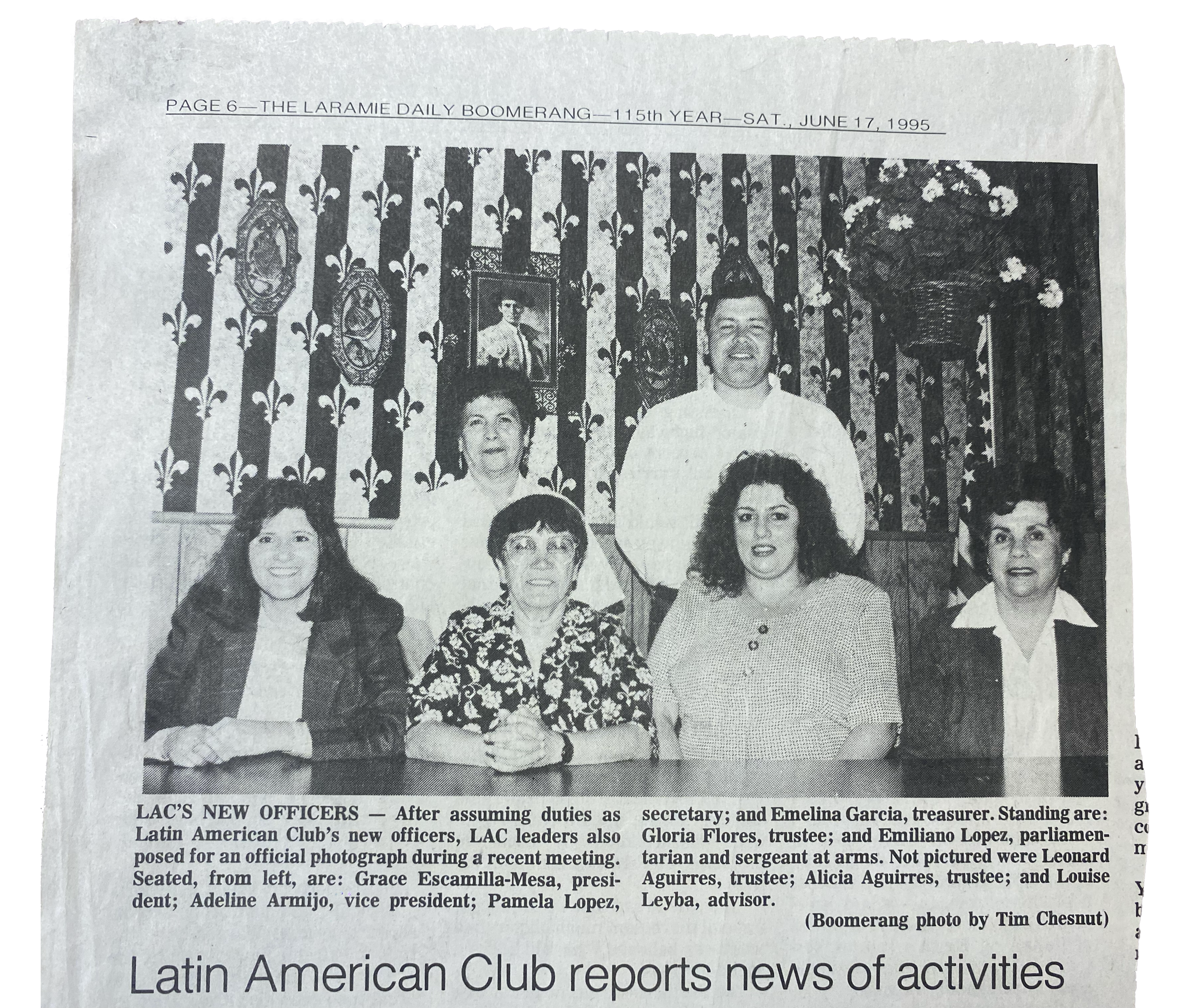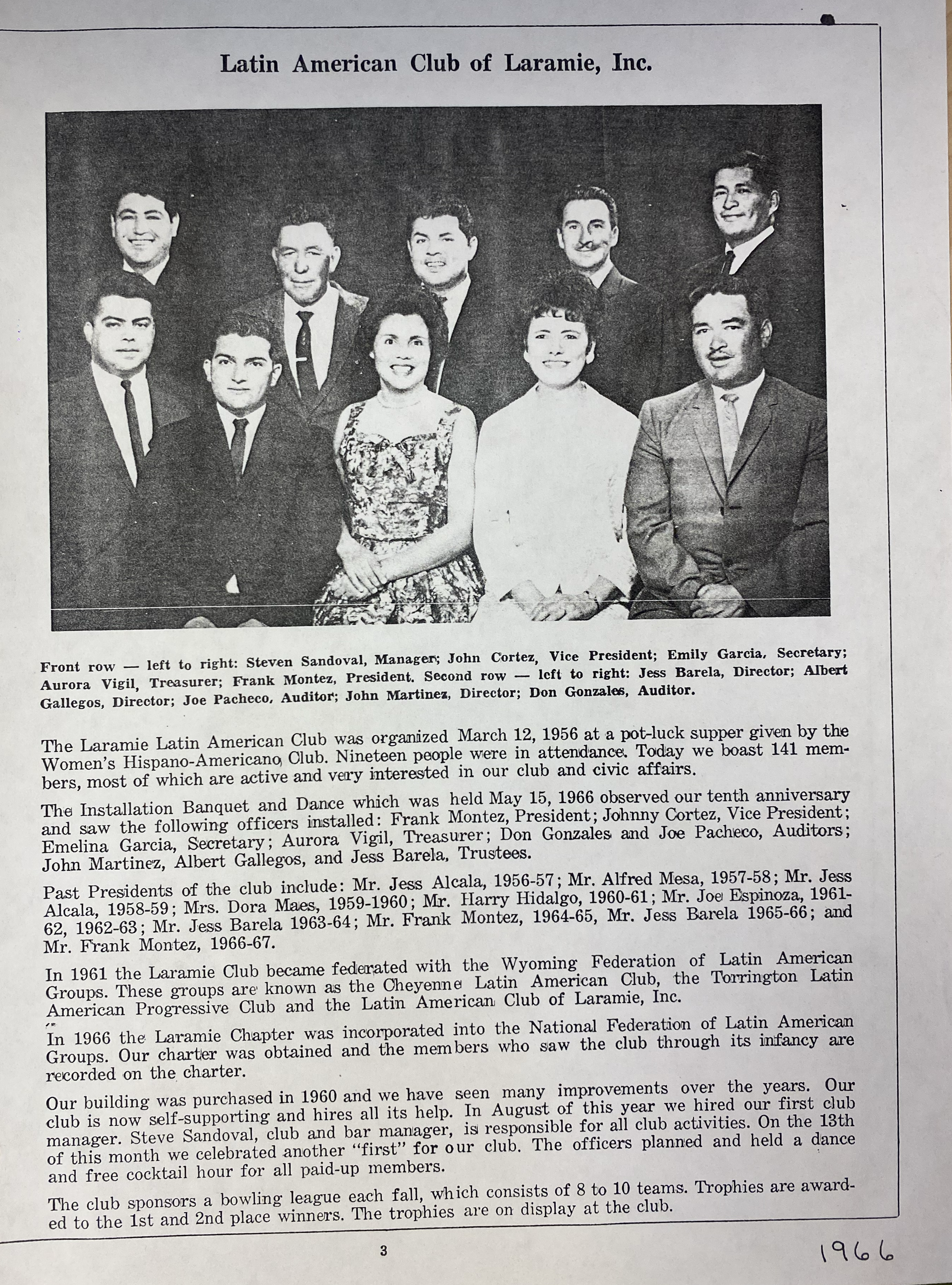 The Latin American Club of Laramie was founded in 1956. It was a nonprofit established to promote Hispanic customs and traditions. It also sought to assist members facing injustice and discrimination.